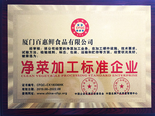 凈菜加工標(biāo)準(zhǔn)企業(yè)黃牌