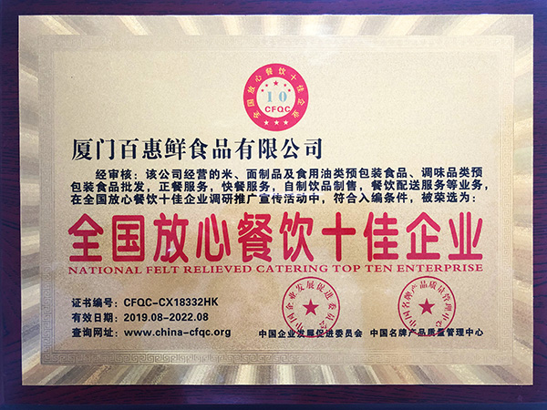 全國(guó)放心餐飲十佳企業(yè)黃牌