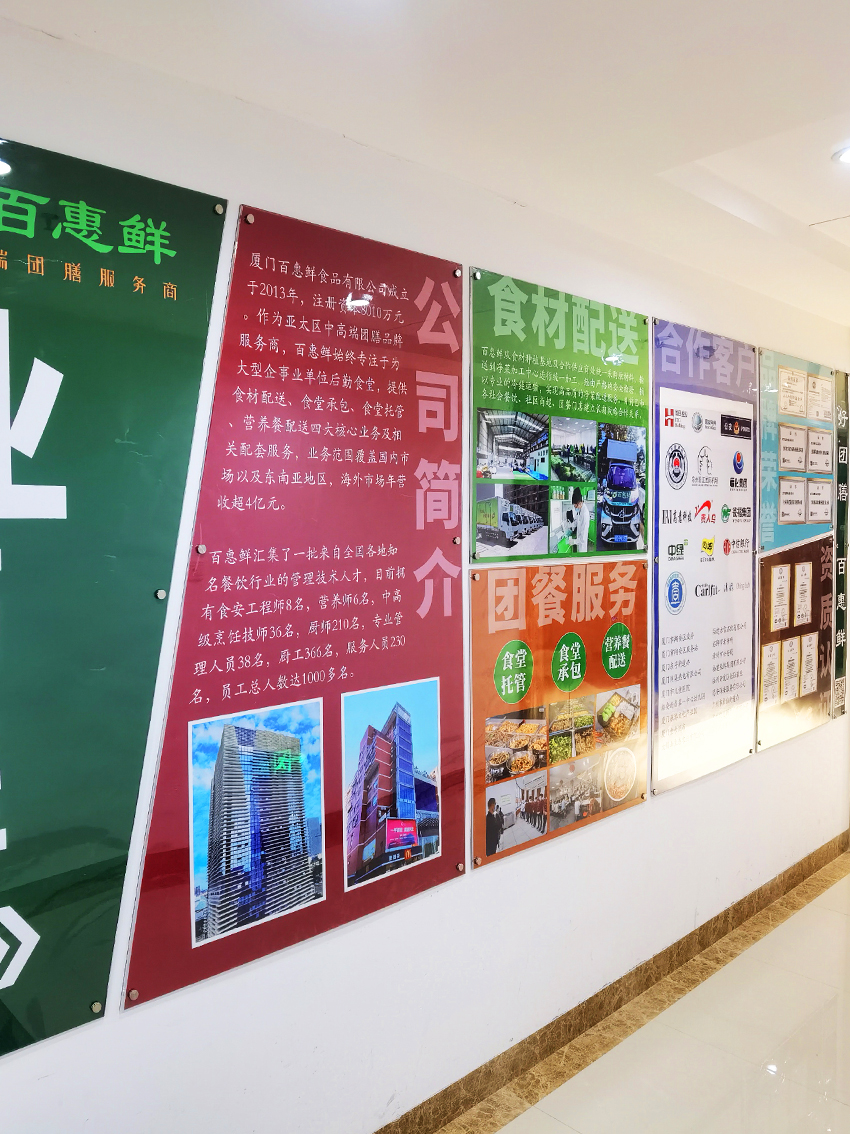 廈門(mén)百惠鮮食品有限公司成立于2013年,注冊(cè)資本8010萬(wàn)元。作為亞太區(qū)中高端團(tuán)膳品牌服務(wù)商,百惠鮮始終專(zhuān)注于為政府機(jī)關(guān)、集團(tuán)企業(yè)、學(xué)校、部隊(duì)、醫(yī)院等單位后勤食堂,提供食材配送、食堂承包、食堂托管、營(yíng)養(yǎng)餐配送四大核心業(yè)務(wù)及相關(guān)配套服務(wù),業(yè)務(wù)范圍覆蓋國(guó)內(nèi)近20個(gè)省、直轄市、自治區(qū),以及菲律賓、馬來(lái)西亞、印度尼西亞等東南亞地區(qū)國(guó)家,海外市場(chǎng)年?duì)I收超4億元。 百惠鮮始終以科學(xué)嚴(yán)謹(jǐn)?shù)膽B(tài)度對(duì)待食品安全,建立了“1+2+5+9”的食安管理模式,并擁有專(zhuān)業(yè)的食品安全檢測(cè)室、微生物檢驗(yàn)室,嚴(yán)格把關(guān)原材料;百惠鮮全面通過(guò)ISO9001質(zhì)量管理體系認(rèn)證、ISO14001環(huán)境管理體系認(rèn)證、ISO22000食品安全管理體系認(rèn)證、ISO45001職業(yè)健康安全管理體系認(rèn)證、HACCP危害分析與關(guān)鍵控制點(diǎn)體系認(rèn)證,是4D、6T、7S現(xiàn)場(chǎng)管理體系合格/示范單位。 百惠鮮始終秉承“誠(chéng)信務(wù)實(shí)、以人為本、勤于創(chuàng)新”的經(jīng)營(yíng)理念,十分重視人才培養(yǎng),公司匯集了一批來(lái)自全國(guó)各地知名餐飲行業(yè)的管理技術(shù)人才,目前擁有食安工程師8名,營(yíng)養(yǎng)師6名,中高級(jí)烹飪技師36名,廚師210名,專(zhuān)業(yè)管理人員38名,廚工366名,服務(wù)人員230名,員工總?cè)藬?shù)達(dá)1000多名。百惠鮮公司成立以來(lái)陸續(xù)獲得了“中國(guó)團(tuán)餐十佳品牌”、“中國(guó)營(yíng)養(yǎng)餐優(yōu)秀企業(yè)”、“全國(guó)綠色餐飲企業(yè)”、“福建省餐飲行業(yè)指定食材基地”、“食品安全示范單位”等一系列榮譽(yù)稱(chēng)號(hào)。